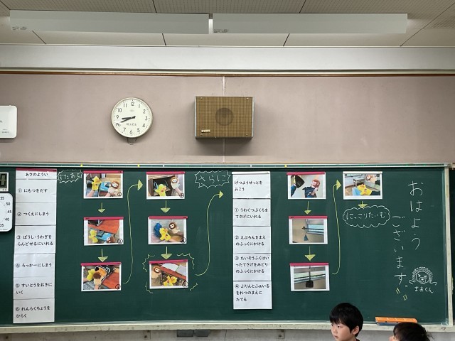 地域の皆さまに支えられて、1年生の学校生活がスタートしています1年生の教室では、朝の準備や帰りの支度がスムーズにできるよう、分かりやすい黒板掲示を工夫しています。写真つきで「朝の準備」「帰りの準備」を示しているため、子どもたちも見ながら自分で行動しやすくなっています。