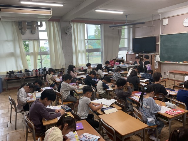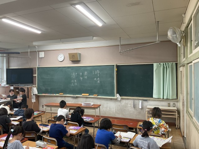 子どもたちは、学習した「時」や「活」の漢字を、ノートにしっかり・丁寧に書いていました。先生のチェックを受けながら、どの子も集中して取り組む姿が見られました。