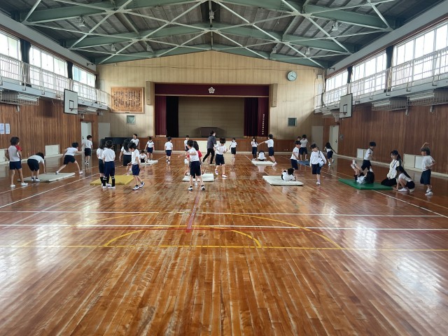 体育館では、前転やバランスポーズなど、マットの基本技に挑戦しました。技が終わったあとには、「ピタッ」とポーズを決めることを意識している子どももいました。