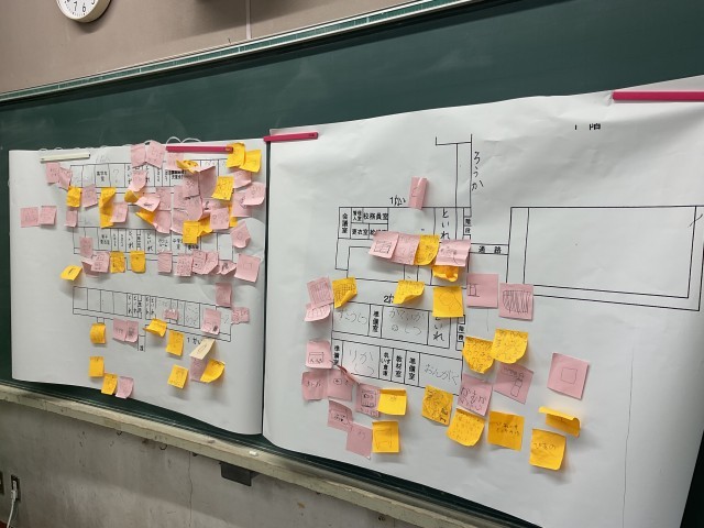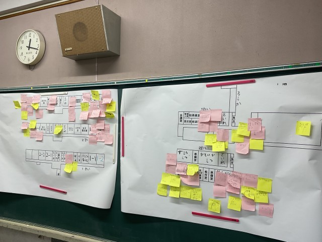 探検の途中で見つけたことや気づいたことは、付箋にどんどん書いていきました。子どもたちの手には、あっという間に 付箋がいっぱい。「こんなところにこんなものがあったよ」「ここはこんな使い方をするんだね」と、発見の連続でした。教室の掲示には付箋でいっぱいです。