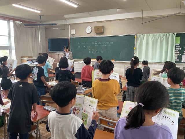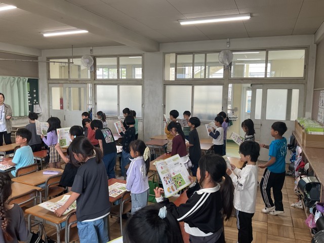 「小犬のビンゴ」では、元気いっぱいの大きな声が教室に広がり、自然と体を揺らしたり、リズムに合わせて手をたたいたりする姿が見られました。