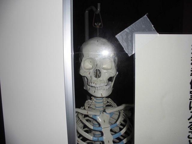 会議が終わって学校に戻ってきました。機械警備を解除して、誰もいない真っ暗の校舎に入ります。ちょっとだけ仕事をして、最後に校内を巡回し機械警備をセットして帰るのですが、途中廊下から理科準備室を撮ってみました。納涼にいいかも?
