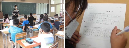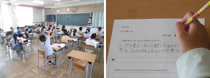 本日4限目、4年生の道徳の授業の様子です。きょうの教材は、教科書の「ドッジボール」です。「いく子は一郎にボールを当てた。しかし一郎は、ワンバウンドしたからセーフだと言う。その様子を一番近くで見ていた明はアウトだと言うが、他のクラスメイトは、力が強く勉強や運動ができる一郎に味方をして・・・」というような内容です。児童たちは先生の巧みな発問で、しっかりと手を挙げて自分の意見を発表し、考えを深めているようでした。