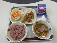 今日のメニューは「かきたま汁、焼き魚(ほっけ)、キムタクごはんの具、ごはん、牛乳」でした。※キムタクごはんは、長野県の学校給食で初めて作られました。キムチとたくあんが入った献立です。