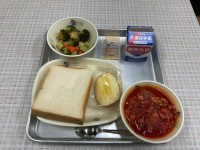 今日のメニューは「かきたま汁、こぎつねどん、チンゲンサイの炒め物、ご飯、牛乳」でした。