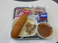 今日のメニューは「じゃがいも餅のおつゆ、豚キムチ、ひじきピーマン、ご飯、牛乳」でした。
