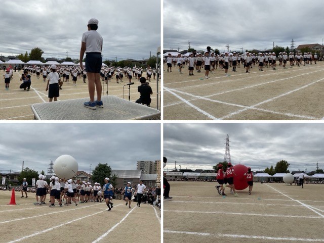 最初の競技、全校児童による「大玉転がし」は白組の勝利でした。