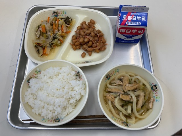 今日のメニューは「きつねうどん、じゃこまめ、白菜のポン酢風味、ご飯、牛乳」でした。