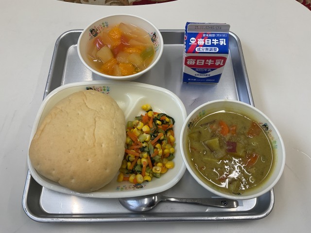 今日のメニューは「カリー・ガー、コーンソテー、フルーツポンチ、オリーブパン、牛乳」でした。