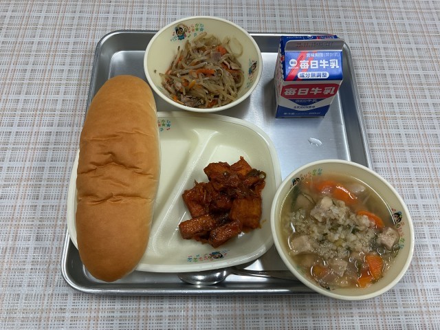 今日のメニューは「サムゲタン、厚揚げのチリソース、もやしの炒め物、コッペパン、牛乳」でした。