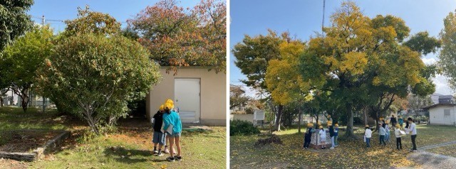 校庭の木も紅葉が見られるようになり、1年生が秋みつけをしていました。黄色の葉や金木犀の花、どんぐり、自分の手よりも大きな葉っぱも見つけていました。