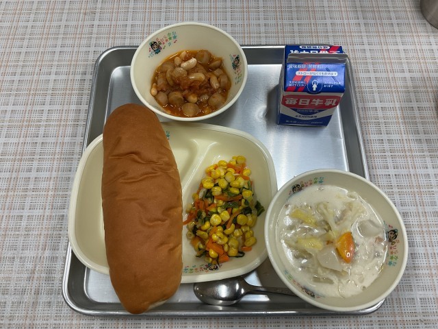 今日のメニューは「冬野菜の米粉クリームスープ、カスレ、コーンソテー、コッペパン、牛乳」でした。