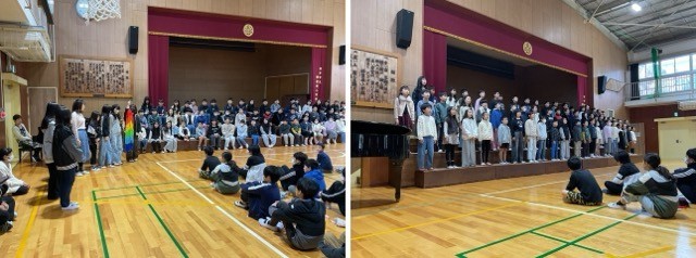 今日の児童集会では、20日の枚方市の合同音楽会に出場する4年生が、当日に歌う歌を全校児童の前で披露しました。少し緊張気味でしたが、きれいな歌声を響かせてくれました。当日が楽しみです。