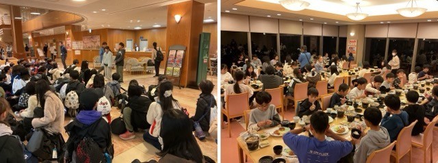 予定通り宿舎に到着しました。館内での注意事項を確認し、待ちに待った夕食です。おかわりする子もたくさんいました。
