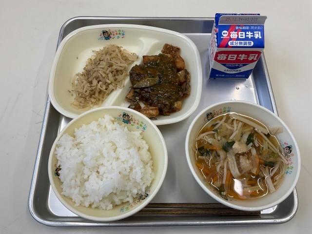 今日のメニューは「玉ねぎのおつゆ、ウマウマ‼︎さばのカレーあんぶっかけ、炒めたくあん、ご飯、牛乳」でした。