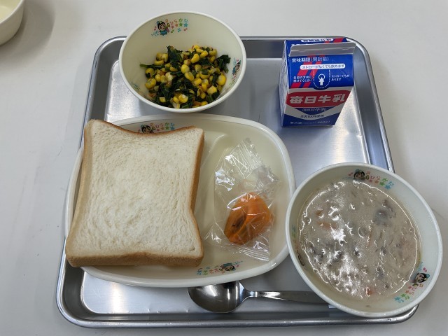 今日のメニューは「ビーフストロガノフ、ほうれん草のソテー、かき、食パン、牛乳」でした。