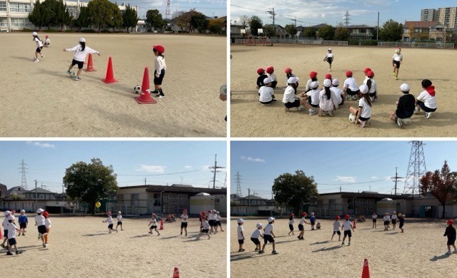 1年生がボール運動に取り組んでいました。サッカーではドリブルなどボールに慣れる動きを中心に、ドッヂボールでは色々な方向から飛んでくるボールをしっかり見て動いたり、狙いを定めて投げたりしました。