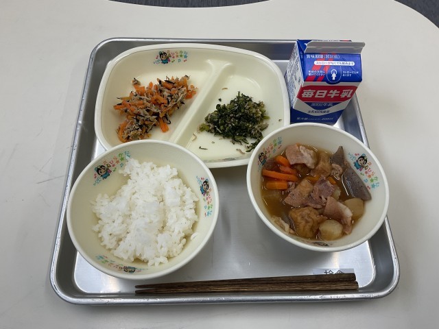 今日のメニューは「豚肉と大根の煮物、ささみとにんじんの甘酢あえ、大根葉の炒り煮、ご飯、牛乳」でした。