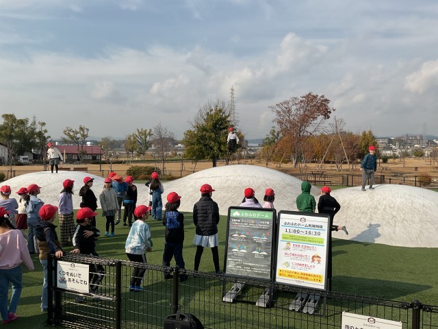 食後は、公園内のふわふわドームで遊びました。天気に恵まれて