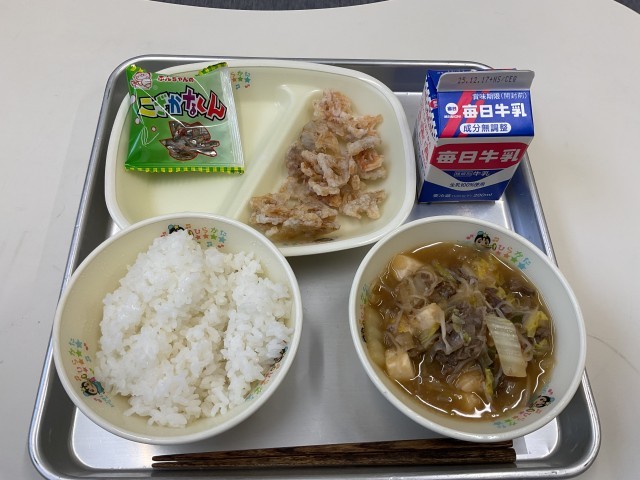 今日のメニューは「すきやき、れんこんの唐揚げ、ミニフィッシュ、ご飯、牛乳」でした。