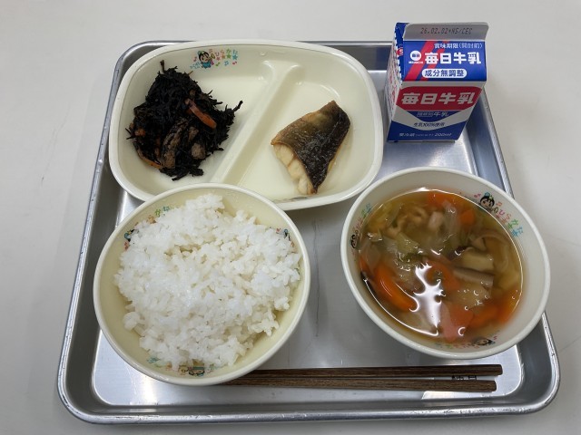 今日のメニューは「せんべい汁、ほっけ、ひじきの炒め、ごはん、牛乳」でした。