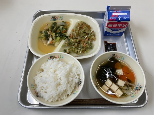 今日のメニューは「すまし汁、お好み揚げ、大阪白菜の煮浸し、こぶくろソース、ごはん、牛乳」でした。