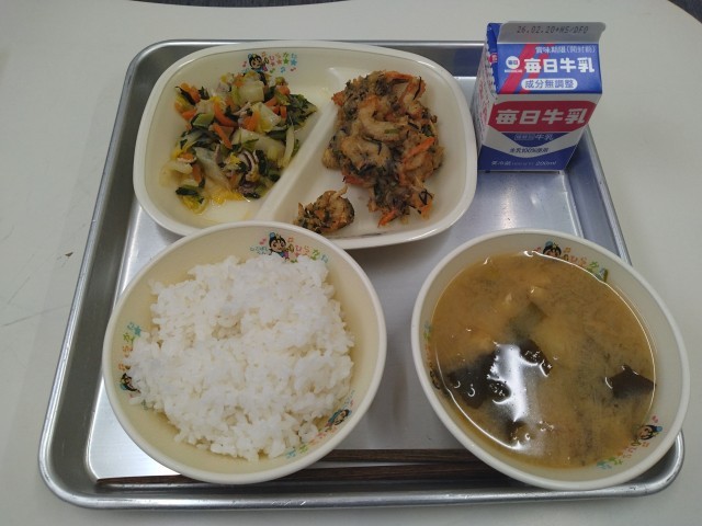 今日のメニューは「みそ汁、けんちんあげ、白菜の塩こうじ炒め、ごはん、牛乳」でした。