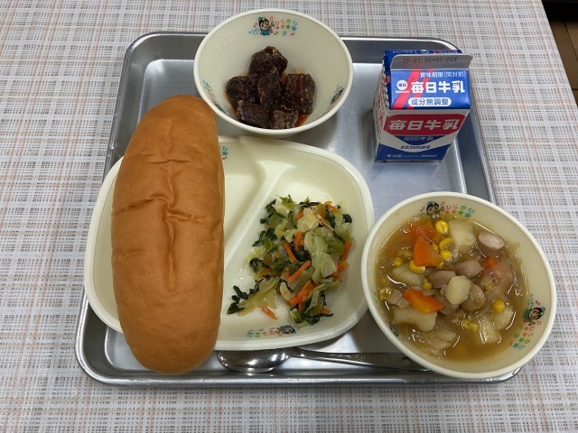 今日のメニューは「スープ煮、くじら肉のノルウェー風、チンゲンサイのソテー、コッペパン、牛乳」でした。