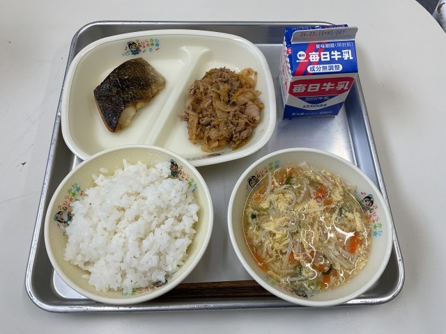 今日のメニューは「かきたま汁、焼き魚(ほっけ)、キムタクごはんの具、ごはん、牛乳」でした。