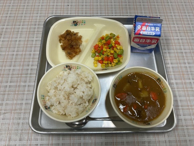 今日のメニューは「ビーフカレー、コロコロソテー、福神漬け、玄米ごはん、牛乳」でした。