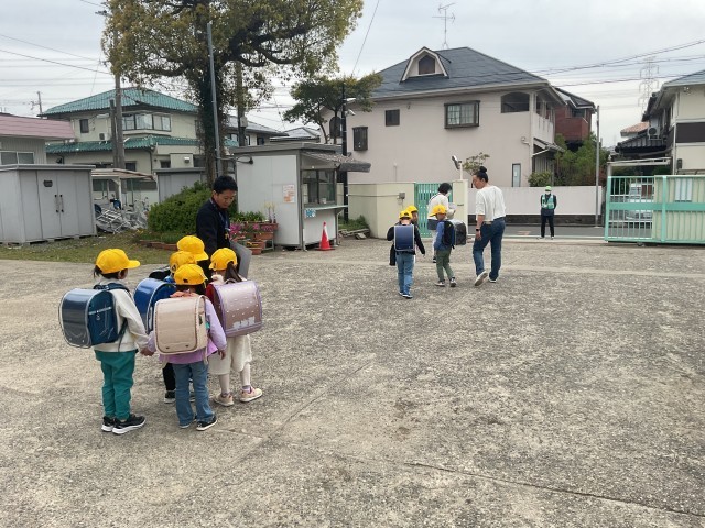 1年生の下校です。チームに分かれて担当の先生と下校します。
