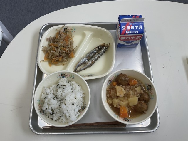 今日の給食はわかめごはん、牛乳、そぼろ煮、ししゃも、もやしの炒めもの です。