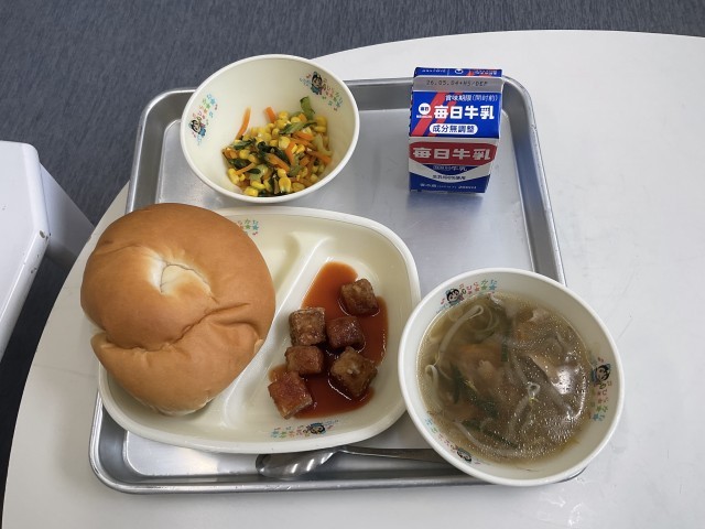 今日の給食は、うずまきパン、牛乳、野菜スープ、まぐろのノルウェー風、コーンソテーです。