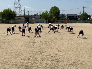 体育では、準備運動で元気よく体を動かしたあと、鉄棒に取り組みました。先生の掛け声に合わせてジャンプしたり、体を曲げたりして、基本の動きをしっかりと練習しています。