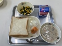 今日のメニューは「かふうスープ、イカの甘辛、キャベツの炒め物、黒糖パン、牛乳」でした。