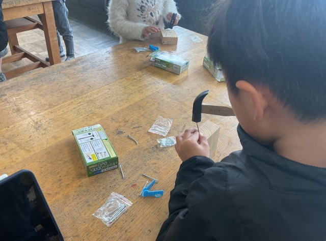 子どもたちが、金づちを使って、