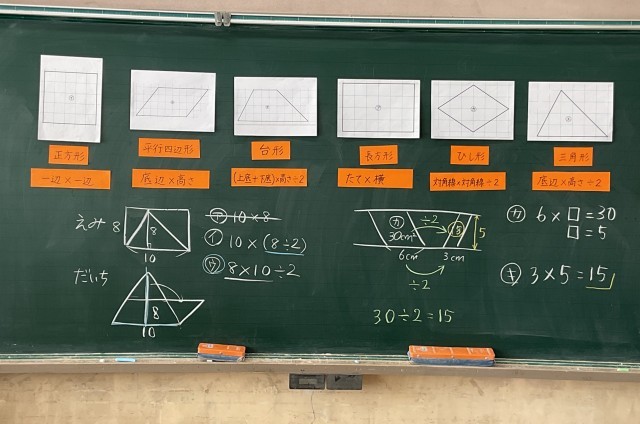 三角形や並行四辺形、台形の面積の求め方などの学習を行っています。