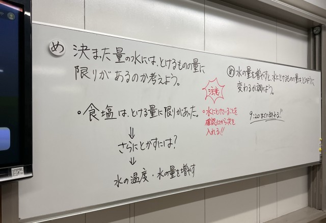 今日のめあては、「水の量を増やすと水に溶けるものの量はどのように変わるか調べよう。」です。