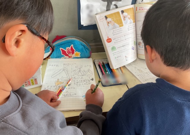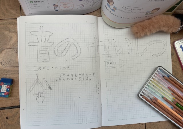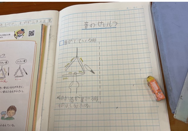 子どもたちのノートを見てみると、指を添えて「ふるえ」を感じている様子が細かく描かれ、ただ知識として覚えるのではなく、「自分の実体験」として理解していますね。
