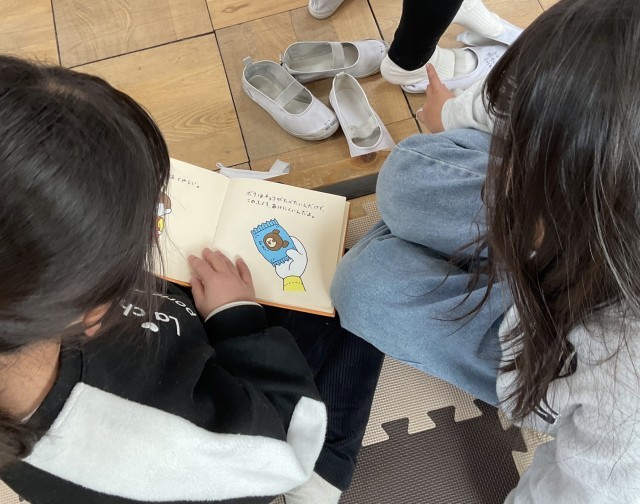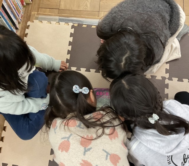 お気に入りの絵本を囲んで、「見て見て!」と顔を見合わせて物語を楽しむ子ども。