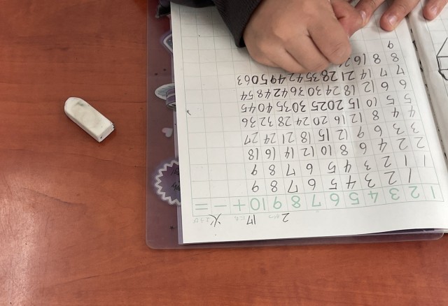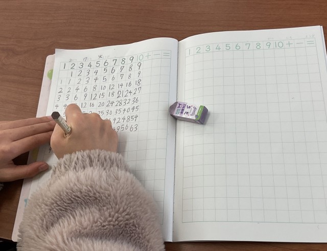 頭の中で九九を唱えながら、一マス一マス丁寧に数字を書き込んでいっています。