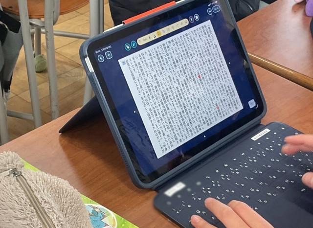 5年生が、資料の具体的なデータをもとに文章の構成を練っています。