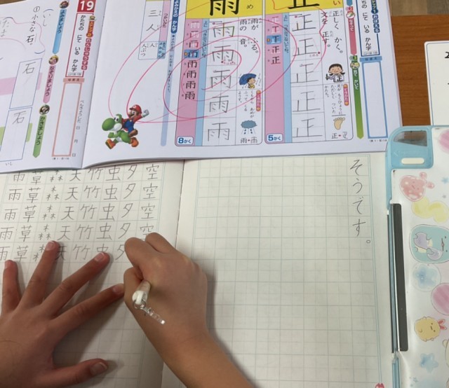 お手本のドリルをじっくり見つめ、「正」や「雨」などの漢字を、一画一画丁寧に練習中です。