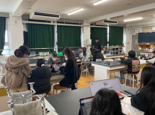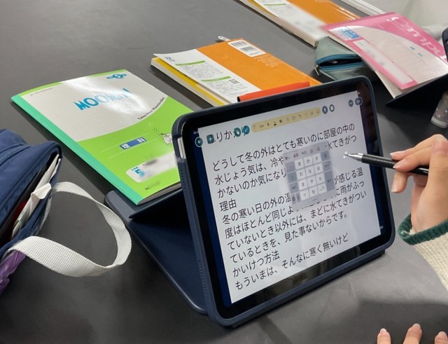 タブレットやノートに向かい、「最初はこう思っていたけれど、実験を通してこう考えが変わった」と、自分の言葉で思考を整理できています。