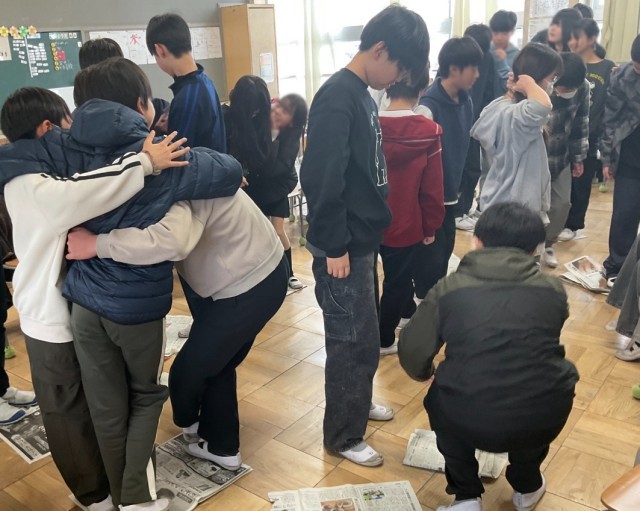 新聞紙が小さくなるたびに、「おんぶするよ!」と声を掛け合う子どもたち。