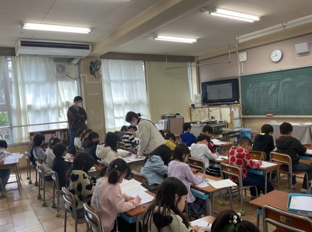 子どもたちは、お手本をじっくりと見ながら、マスの中心を意識して丁寧に鉛筆を動かしています。