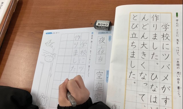「学校にツバメが・・・」という一文も、一文字ずつ形を整えようとする集中力が見られ、着実に書く力が身に付いていますね。