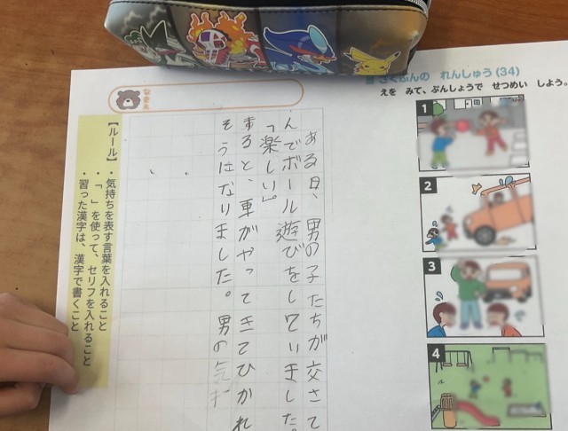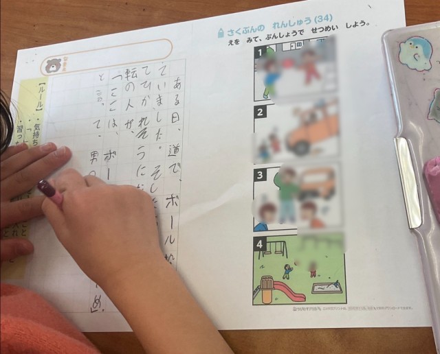 4枚の絵から状況を読み取り、一つの物語として説明する学習です。