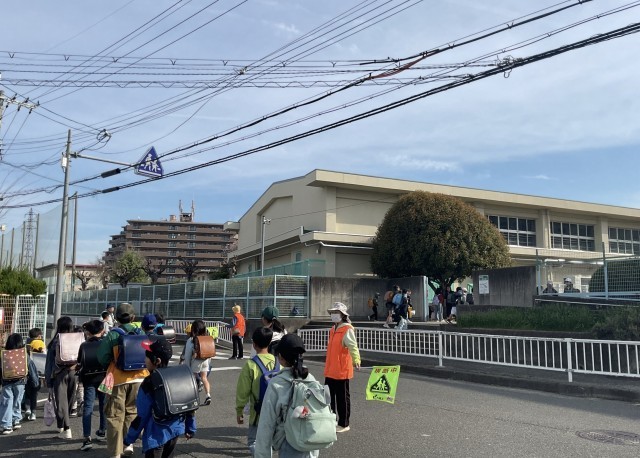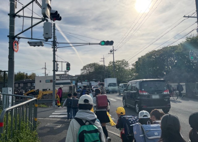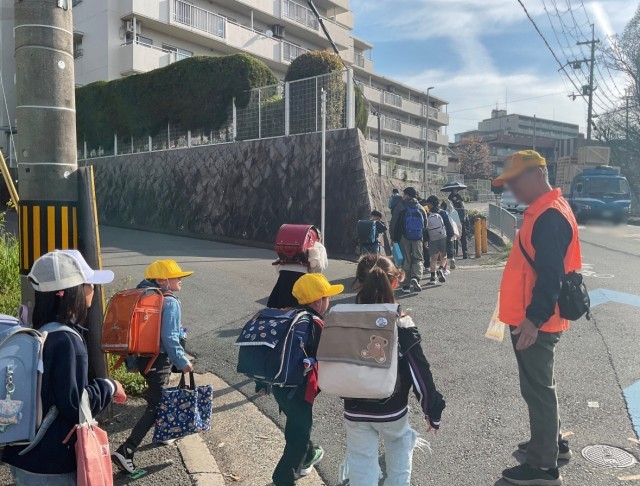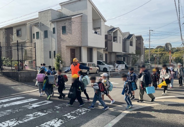 登校時間、通学路を歩くと、オレンジ色のベストを着た方々が笑顔で子供たちを迎えてくださっています。