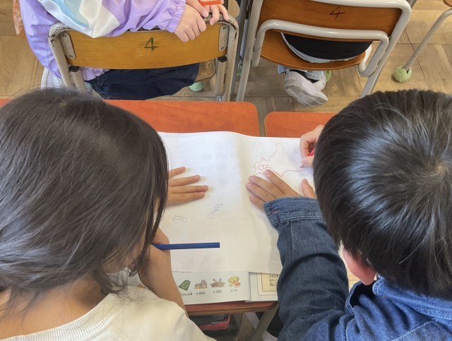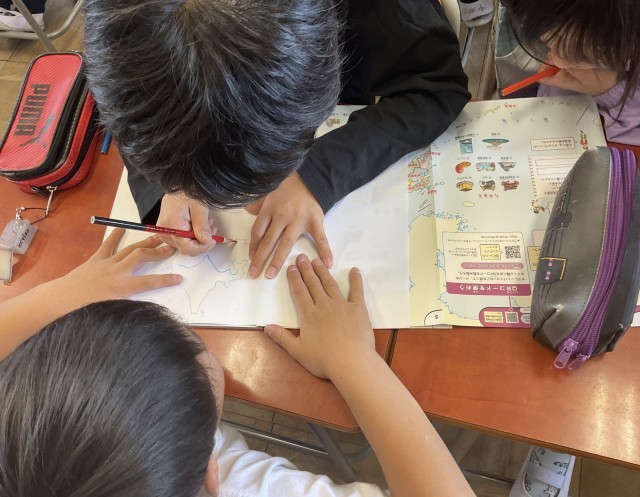 二人ペアで「日本地図」を協力しながら模写しています。